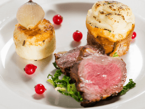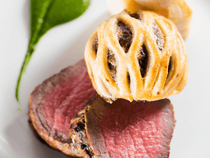 - Blade of beef ‘wellington’ with wild mushrooms, spinach, lattice pastry, butternut and potato dauphinoise