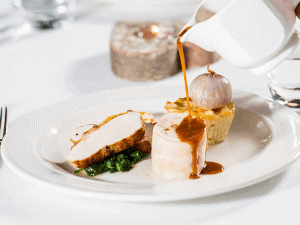 - Tasting of free range chicken roast breast with confit tomatoes, mini pudding, wild braised red cabbage, parsnip and apple puree, port wine and juniper sauce