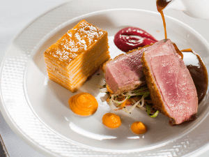 - Roast crispy Gressingham Duckling With spiced red plums, pink peppercorns and Madeira