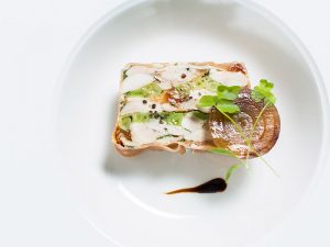 - Wild mushroom and Fourme d’ambert cheese tart, watercress essence