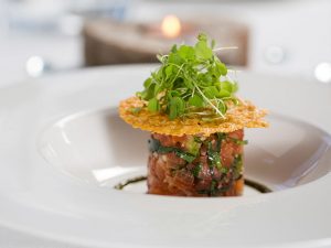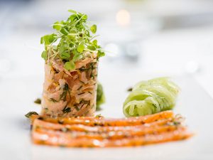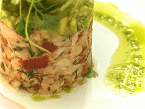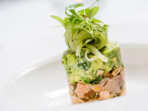 - Tian of lightly smoked trout and crushed spiced avocado, cucumber pickle, sesame and honey