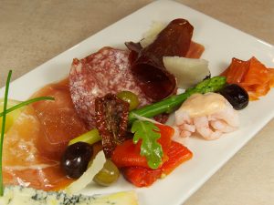 - Antipasto Parma ham, salami, bressola, olives, sun blushed tomato, prawns ,smoked salmon, rocket, parmesan
